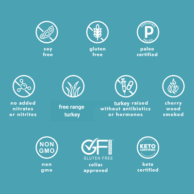 Ingredients: 100% Free Range Turkey*, Water, Organic Coconut Sugar, Organic Coconut Aminos ( organic coconut sap, sea salt), Organic Apple Cider Vinegar, Sea Salt, Organic Garlic, Organic Matcha Tea, Organic Ginger, Organic Red Pepper Flakes.